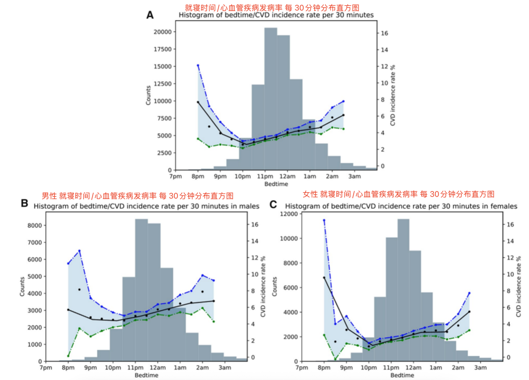 睡眠开始时间与心血管疾病发病率之间的关系,(A)总体样本,(B)男性,(C)女性,图源:参考文献 [1]