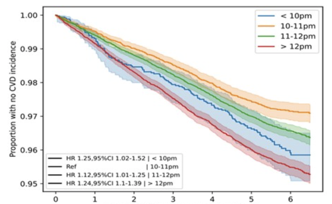 研究人员把这些人分成四组:晚上10:00前入睡、晚上10:00~10:59入睡、晚上11:00~11:59入睡和午夜后才入睡。然后,他们对参与者进行了平均5.7年的随访,统计谁在这段时间里新发了心血管疾病(如心梗、中风、心衰等)。