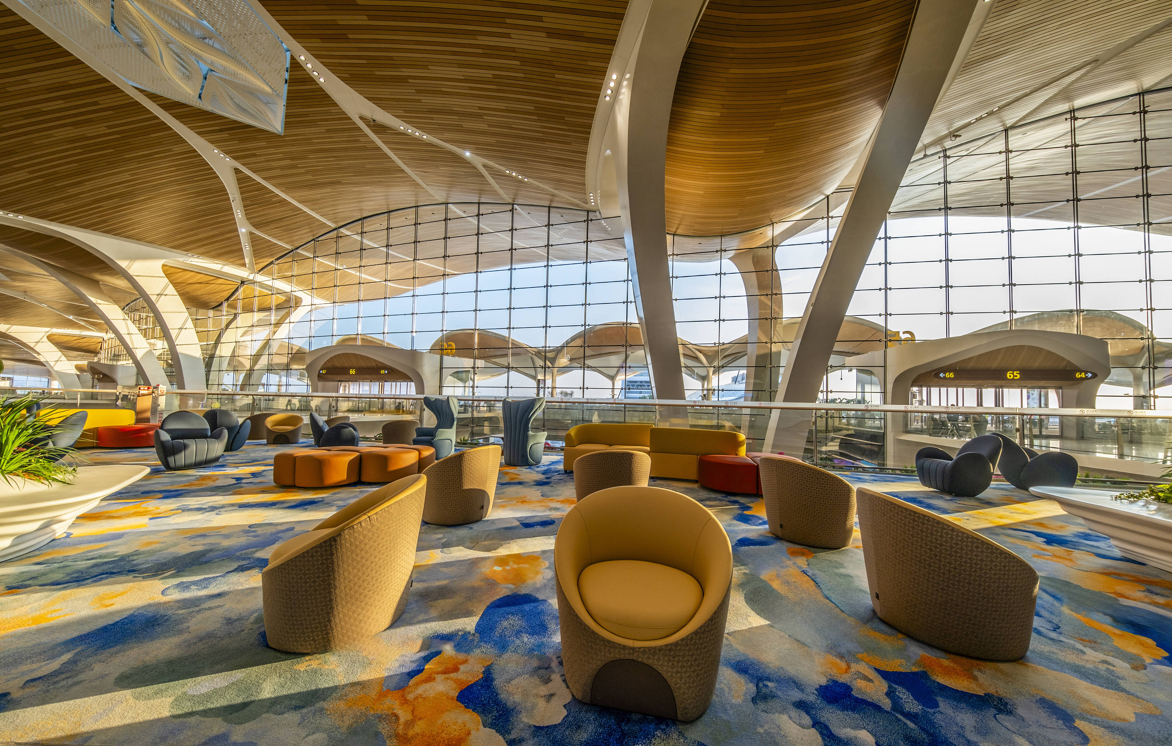 T3航站楼采用别具一格的暖色调设计,营造舒适温暖的空间氛围。值机大厅以三排花冠柱大跨钢结构支撑主楼屋盖钢结构,3.3万平方米的无柱大厅气势恢宏。